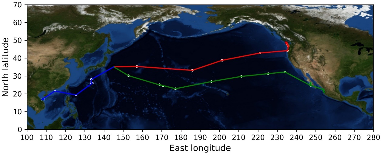 除宏观扩散外,研究人员还从微观角度进行了氚的扩散模拟。与宏观扩散分析注重污染物的整体分布不同,微观扩散分析更加关注污染物个体的行为,也因此它能够支持污染物的扩散路径分析。例如,对模拟结果中到达沿岸海域的某三个污染物微粒,以400天为取样间隔,得到它们的运动轨迹。基于这些运动轨迹,可以知道美洲沿岸海域的污染物主要通过横跨太平洋到达。