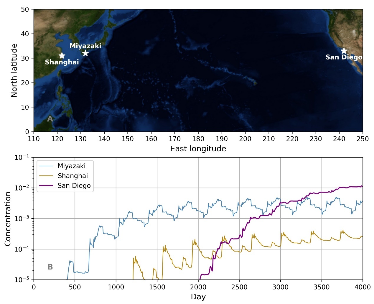 研究人员进一步选取了日本宫崎、中国上海和美国圣迭戈这三个沿海城市进行对比,从污染物浓度变化曲线图中可以发现,在第4000天时圣迭戈附近的污染物浓度大约为0.01个单位,这一数值已经是宫崎的三倍左右、上海的40倍左右。出现这一现象的原因主要是日本附近强烈的洋流作用,福岛处于日本暖流(向北)和千岛寒流(向南)交汇的地方,所以大部分污染物不会沿着陆地边缘向南北方向迁移,而是随着北太平洋暖流向东扩散。这一结果也意味着,在核污水排放的早期,应主要考虑它对亚洲沿岸的影响。但在后期,由于北美沿岸海域的污染物浓度将持续高于大部分东亚沿岸海域,需要重点关注北美沿岸海域的受影响情况。