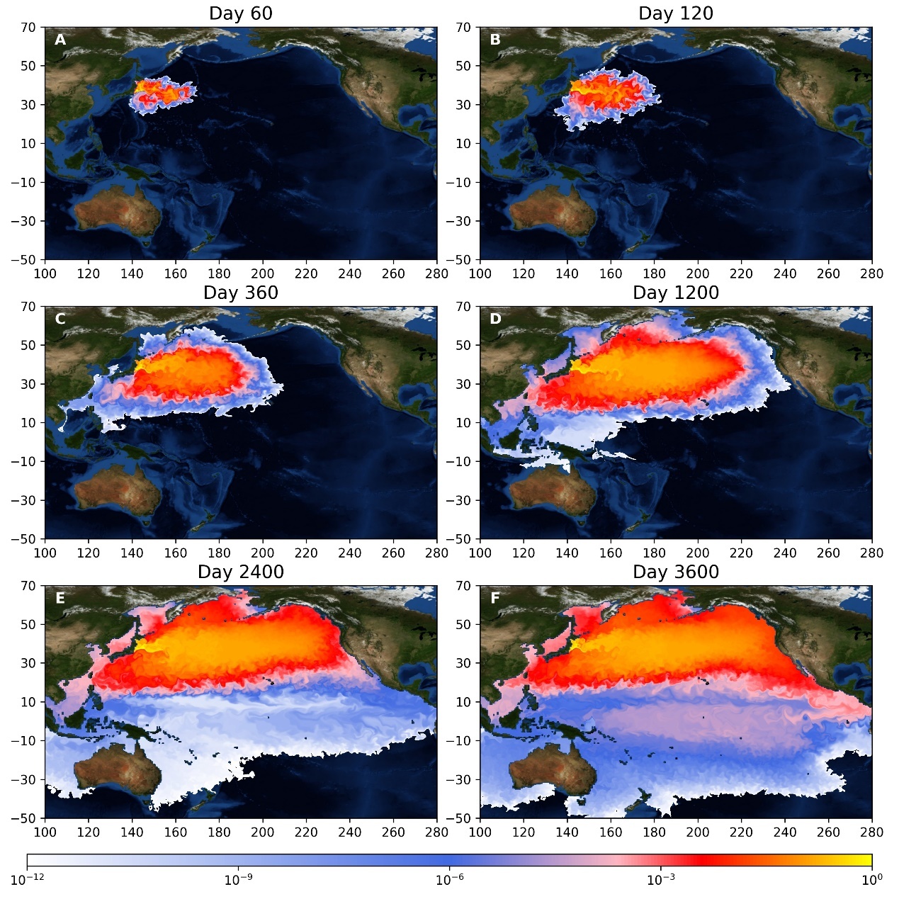 随后,污染物一边在赤道洋流的作用下沿着美洲海岸向南太平洋快速扩散,另一边通过澳大利亚北部海域向印度洋转移。值得注意的是,尽管污染物的排放位置是在福岛附近,但随着时间的推移,污染物高浓度区域将沿着35°N线附近向东延伸,从开始的东亚附近海域扩散到北美附近海域。在第2400天时,中国东南沿岸海域主要呈现浓度较低的浅粉色,而北美西侧海域已经基本被浓度较高的红色覆盖。
