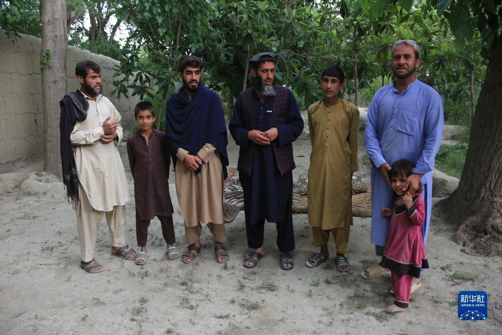 这是5月15日在阿富汗东部楠格哈尔省查帕尔哈尔地区拍摄的穆罕默德·纳西姆(中)与他的家人们。新华社发(赛义夫拉赫曼·萨菲摄)