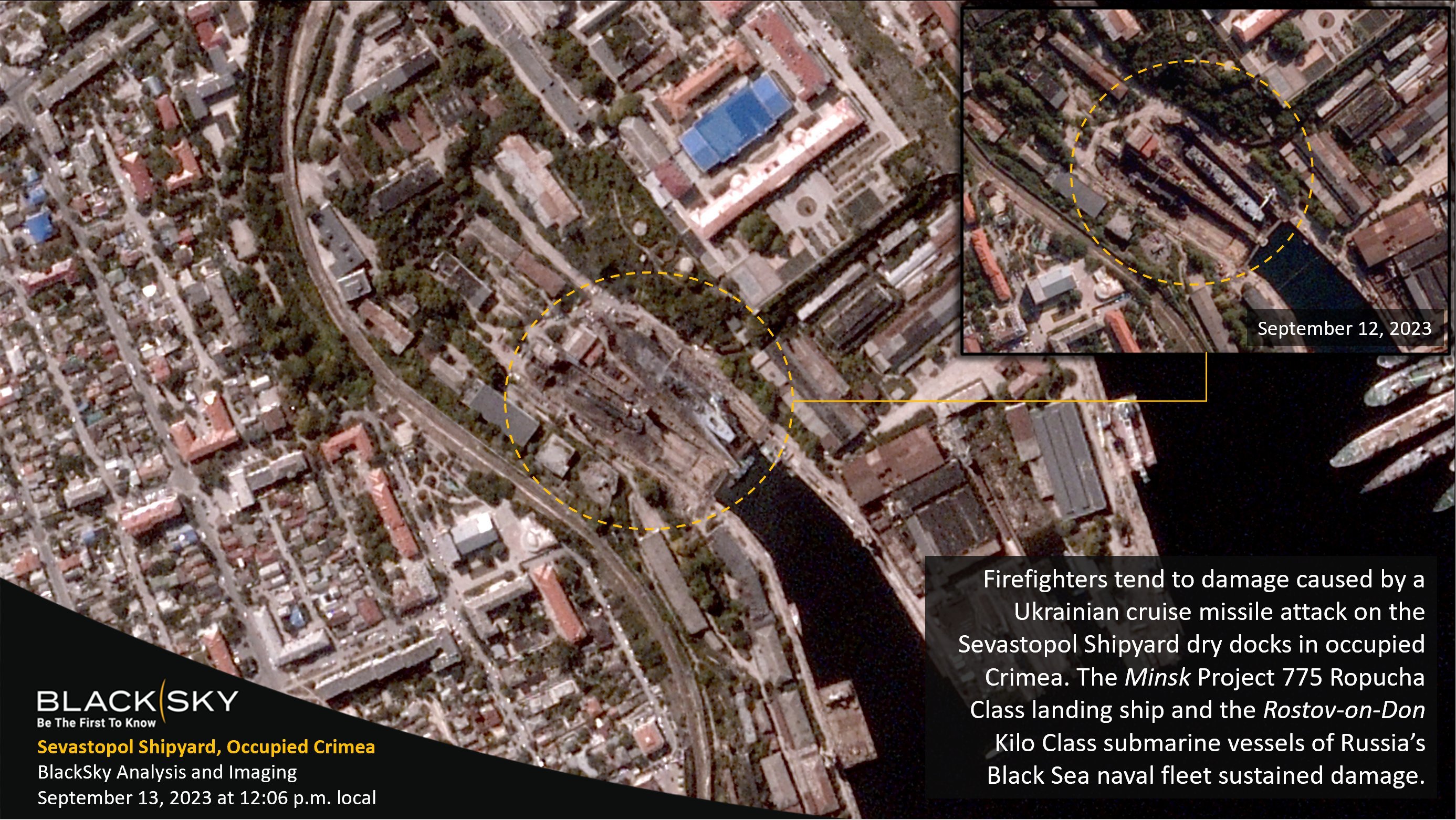 美国商业影像公司Black Sky13日晚间在社交平台上发布了9月12日和13日袭击当天拍摄的造船厂俯视图像。图像显示,两艘舰艇明显受损。