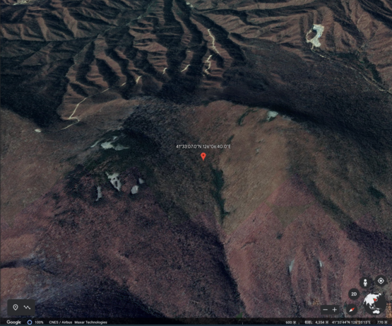 新发现的白鸡峰陨石坑具体位置是北纬41°33'07",东经126°06'40",从航拍影像上来看,这坑真不算是很圆的。