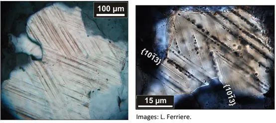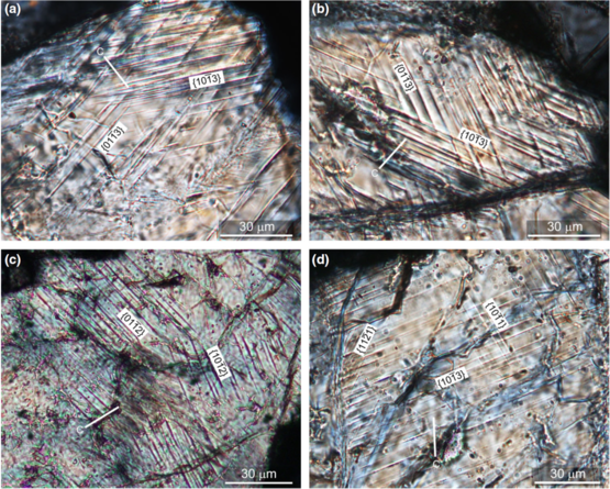 典型的石英晶粒中的面状变形构造,来自:(左)加拿大Bosumtwi陨石坑 | 参考文献[6](右)芬兰的Keurusselka陨石坑 | 参考文献[7]。图中都是平行于两个不同方向的情况。