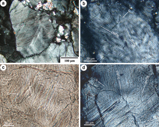 岫岩陨石坑花岗岩碎屑中石英晶粒在正交偏振光下显示出的面状变形构造特征,显微照片 | 参考文献[8]