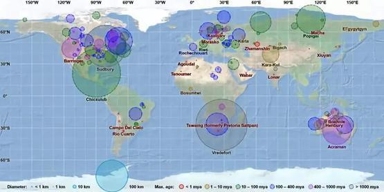 地球上目前已发现的大型陨石坑分布(的不完全统计),注意圆圈大小并不是实际的陨石坑大小,但正比于实际陨石坑的大小 | 维基