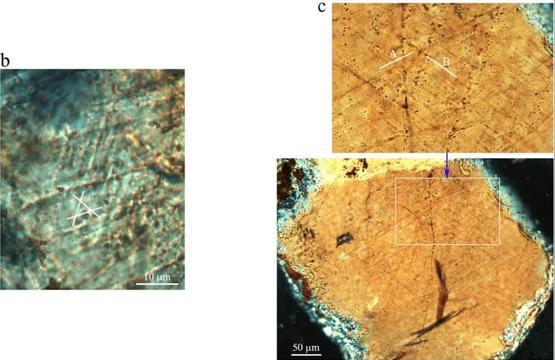 光学显微镜在白鸡峰陨石坑坑内采集的石英颗粒中探测到的面状变形构造(白色实线),正交偏正光 | 参考文献[1]