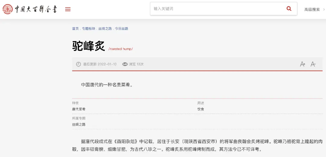 杜甫在《丽人行》中写过“紫驼之峰出翠釜,水精之盘行素鳞”,用以讽刺杨国忠等人的骄奢淫逸,而《明皇杂录》和《酉阳杂俎》中也都有烹饪驼峰的内容。