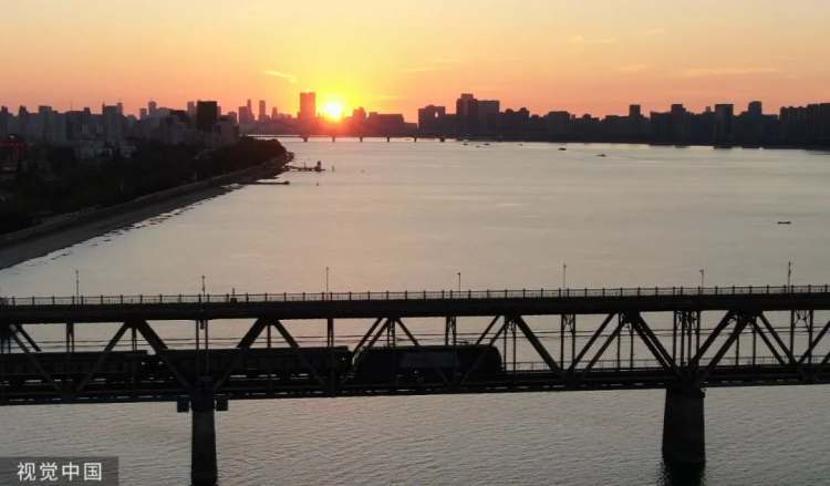 杭州,太阳升起时,一列车正驶过钱塘江大桥。(图/视觉中国)