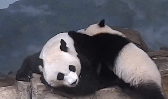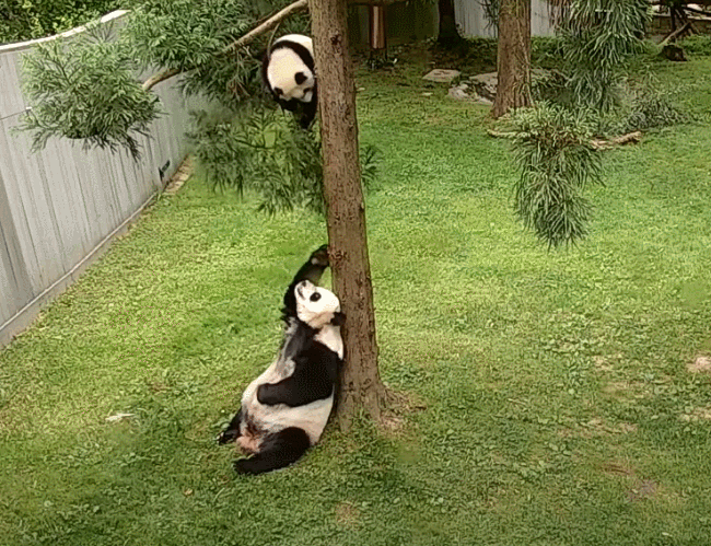 “小奇迹”和“美香”在树边玩耍。动图来源:美国国家动物园社交媒体