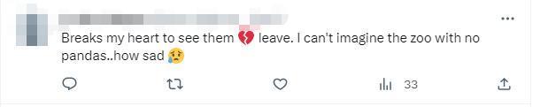 “看到它们要离开,我的心都要碎了。无法想象没有熊猫的动物园……好悲伤。”