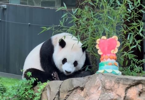 2023年8月,“添添”在美国国家动物园庆祝了自己的26岁生日,坐在洒满阳光的草地上,慢慢品尝水果汁、红薯泥、胡萝卜泥和蜂蜜做成的“生日蛋糕”。