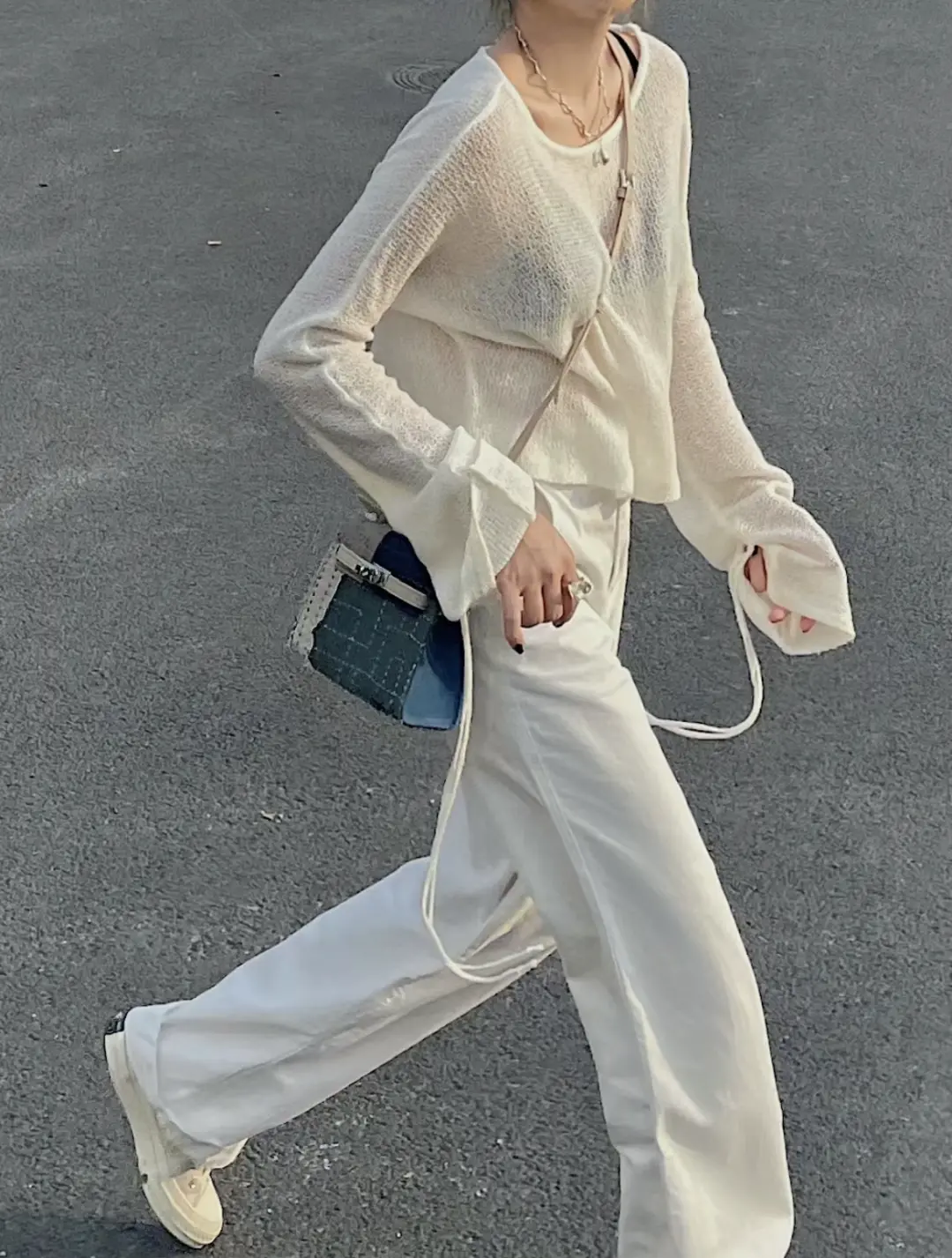 但是现在的大领口+细针织,还带一点透视感,能显得更加轻盈,可以放心穿。