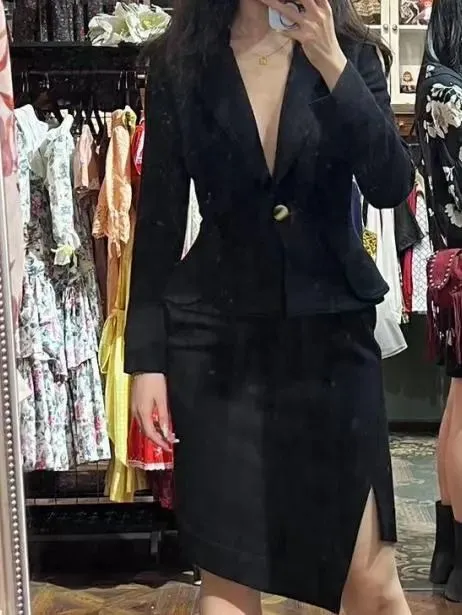 小个子穿这种收腰款外套尽量不要搭配长裙!选俏皮感的短裙可以中和收腰西装的正式感,再搭一双黑色小腿袜/高筒靴,立刻变大长腿!