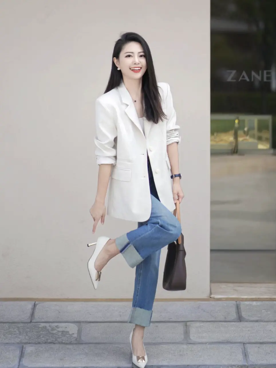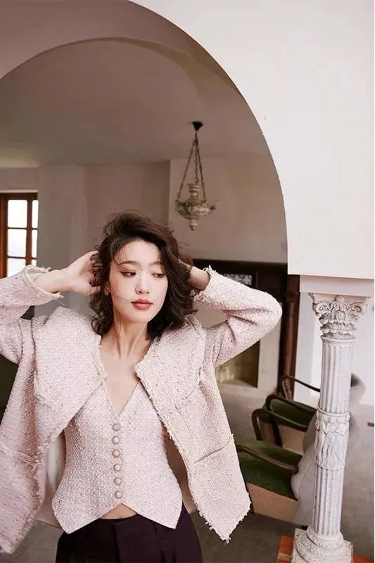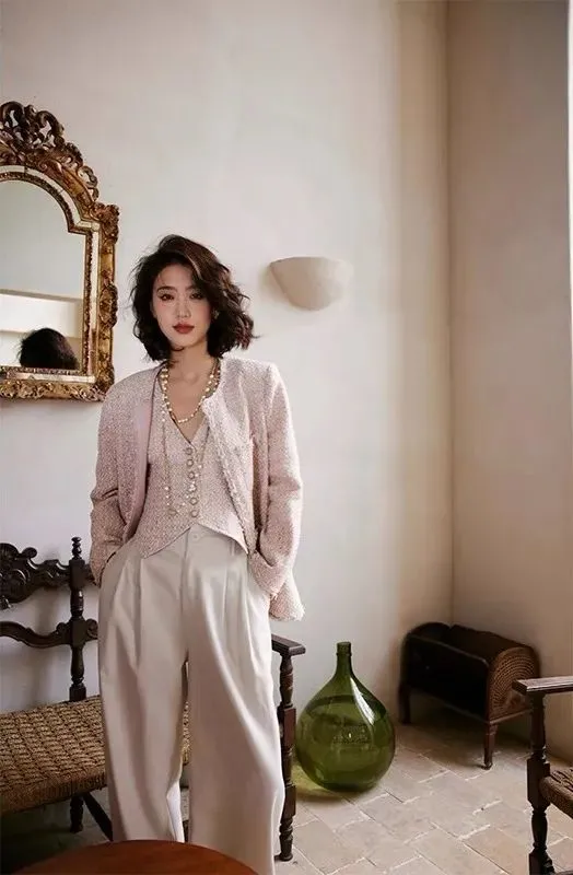 害怕不好驾驭的姐妹,可以选择上身小香风外套+马甲,下身穿帅气的阔腿西装裤。粉色x白色、粉色x棕色都是不错的选择!