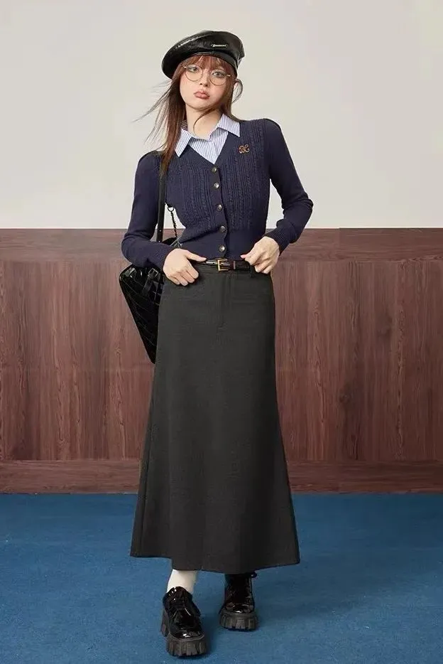 觉得镂空针织不好驾驭,不够保暖的姐妹,可以试试灰色、蓝色系的针织开衫。可以用来搭配一些半身裙、西装裤。