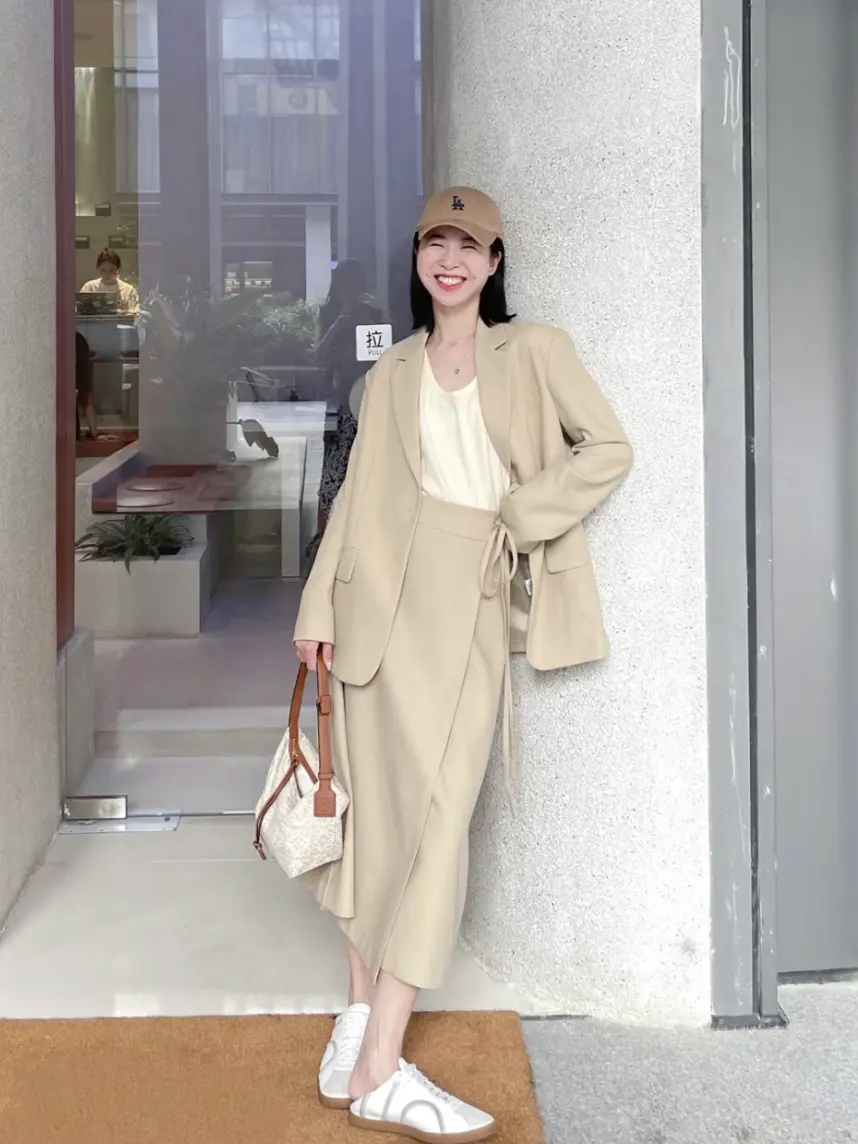 天气还不冷的地区,也可以选择西装+裙子+休闲鞋的组合,更适合甜美优雅系的风格。