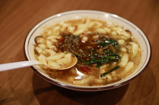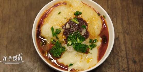 如果土豆被搅成了麻薯一样黏软的质感,就变成了洋芋搅团。半固态半液态地盛在碗里,酸辣味的汤底,搭配韭菜,味道冲击又新奇,能感受到嫩滑的口感和淀粉值max。