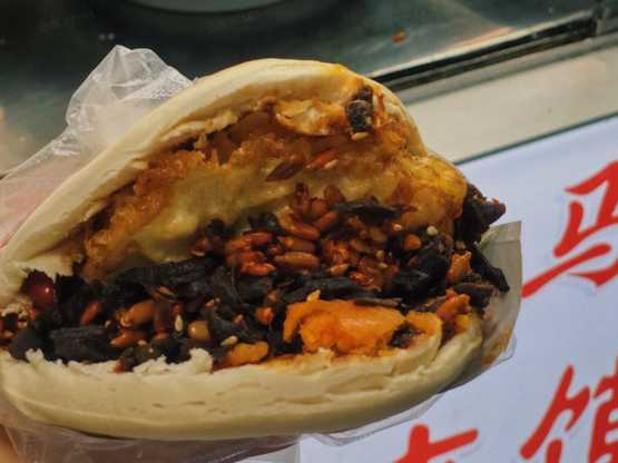 在回坊10元一个的菜蛋夹馍,创意性地加了瓜子仁、炸花生米、果仁、芝麻粒等,闻着就特别香。饱满的咸蛋黄口感粉粉沙沙,再来个溏心的煎蛋,撒一把玫瑰咸菜点缀,味觉层次一下丰富起来。