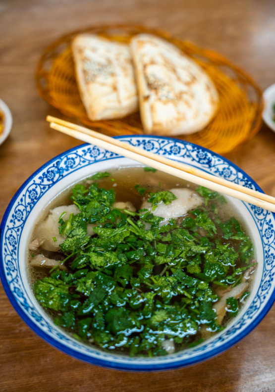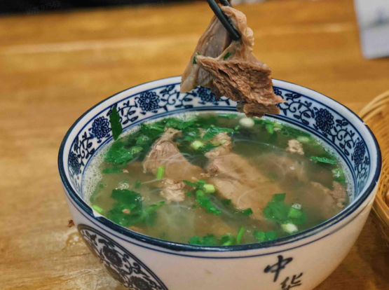 第一口汤的味道微微有点咸,但非常温润醇厚。再来片羊肉,软烂香嫩,不仅没有讨人厌的膻味儿,甚至还有股淡淡的奶香,专治不吃羊肉。底下还垫着一些粉丝,口感劲道。辣子和醋也是每家饭馆标配,加点儿进汤里,每根粉丝都均匀裹上辣子的香气,在秋风渐起的夜晚,大口吸溜,暖乎乎的幸福感蔓延到全身。