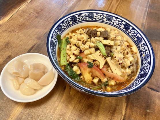 辣子是在端出来时用油现泼的,“呲啦”一声,面条瞬间被赋予了灵魂。跟胡萝卜丁、土豆丁一起混着热油拌开,香得人迷迷糊糊。调料完全入味,面条虽然宽大,但切面很薄,韧劲和筋道兼具,只需吃上一口,碳水血脉就立刻觉醒。“吃面不就蒜,香味少一半”,本地人必须来口蒜,让味蕾更刺激。但份量实在太顶,为了更多美食的开疆拓土,建议两人点一份即可。