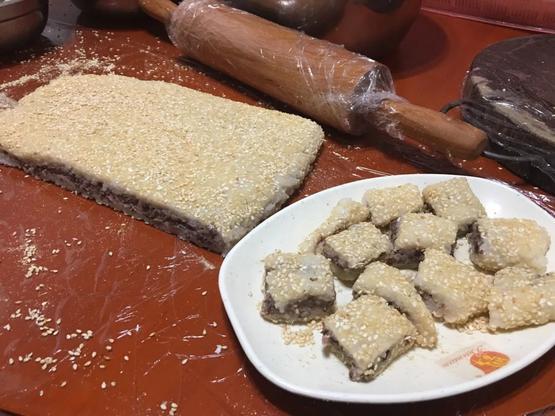 如果喜欢类似酥脆表皮、甜蜜流心的食物,江米糕也值得一试。果仁、黑白芝麻混合着红糖白糖为馅,加了大量干果的糖油混合物,哪有不香的?