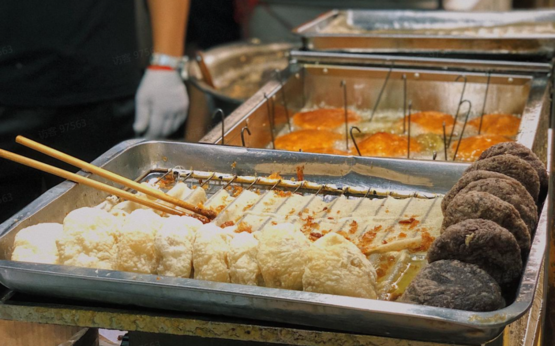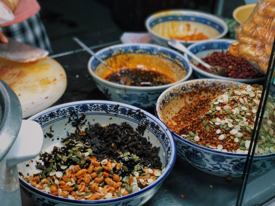 还有西安夜市名吃麻酱涮牛肚,竹签简单穿着牛肚串儿,香喷喷的麻酱掺了点油香的辣子,这个酱料简直蘸鞋底都香。常见组合是豆皮和牛肚,荤素搭配,好吃不贵。
