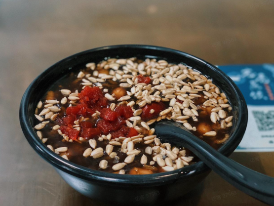跟八宝粥类似的底料用到牛奶鸡蛋醪糟里,营养的感觉瞬间拉满。再多加点黑芝麻、枸杞点缀,一碗现煮的暖暖酒酿,散发着热乎乎的奶香,酒味儿微乎极微。秋冬坐在窗边喝一碗,看路边树影斑驳,心中涌起专属于市井烟火的平稳踏实。