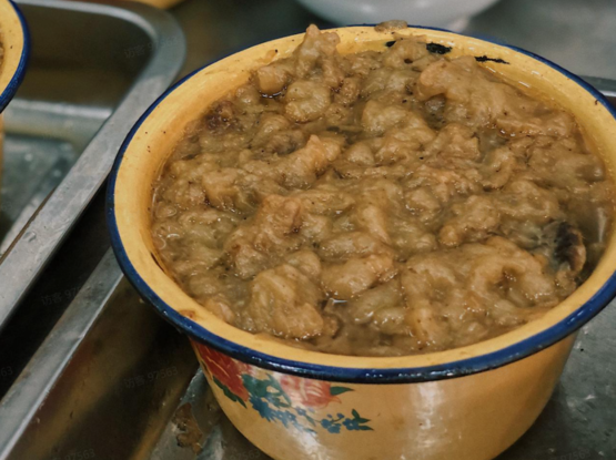虽然也叫小酥肉,可不是干炸,而是汤汤水水的一碗糊糊。炸好的酥肉又重新蒸到软烂后,再泡在汤里。油汪汪的汤里漂浮着脱落的面糊,卖相看着宛如黑暗料理,但实际上是咸味和孜然、花椒、胡椒的存在感拉到最大,来自塞外的冲击感香料,与牛肉天生绝配。酥肉可以蘸店里的辣椒油配饭吃,由于实在太油,并不建议连汤一起扫荡干净。