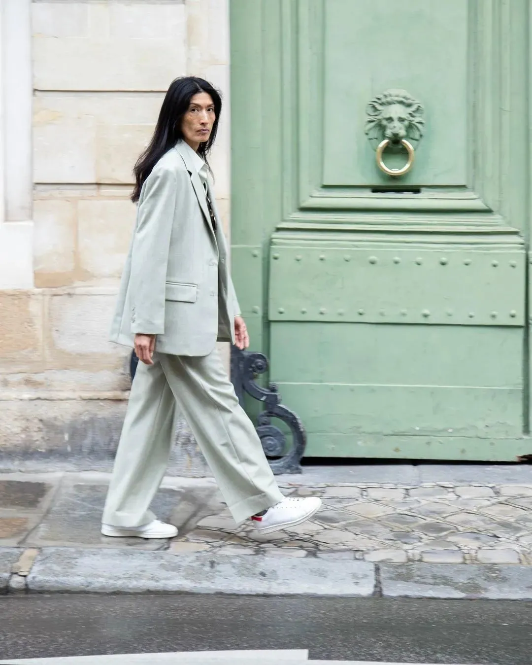直筒牛仔裤、休闲裤,Veja和阿迪达斯小白鞋也是衣柜必备单品,天冷的时候外面套件西装夹克或者大衣风衣,再背上简约无logo的BV枕头包,潇洒随性的巴黎大女人形象跃然纸上。