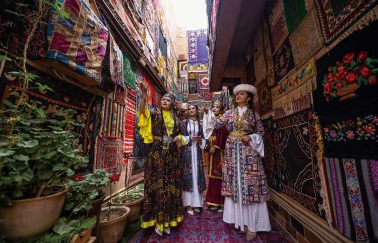 2022年4月21日,新疆喀什,穿着当地传统服饰拍照的人们。(图/由广东援疆前方指挥部提供)