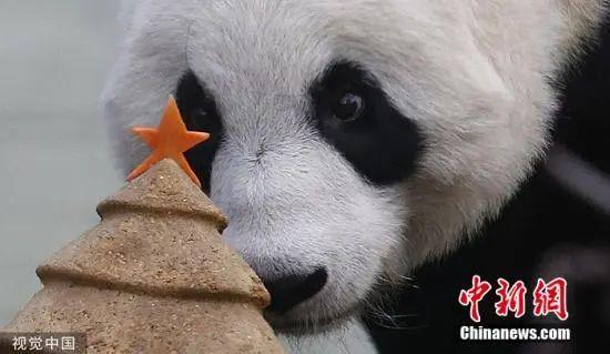资料图:英国苏格兰爱丁堡动物园中的大熊猫“甜甜”享用特制的圣诞树形状的蛋糕。图片来源:视觉中国