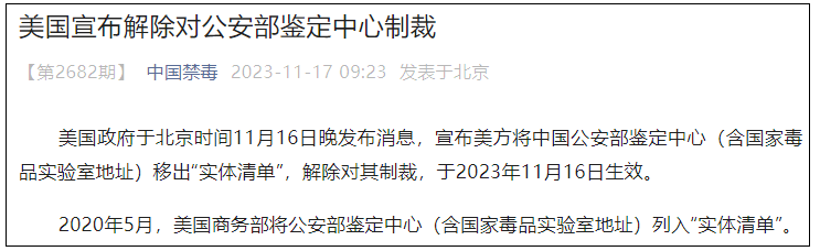 微信公众号“中国禁毒”消息,美国政府于北京时间11月16日晚发布消息,宣布美方将中国公安部鉴定中心(含国家毒品实验室地址)移出“实体清单”,解除对其制裁,于2023年11月16日生效。