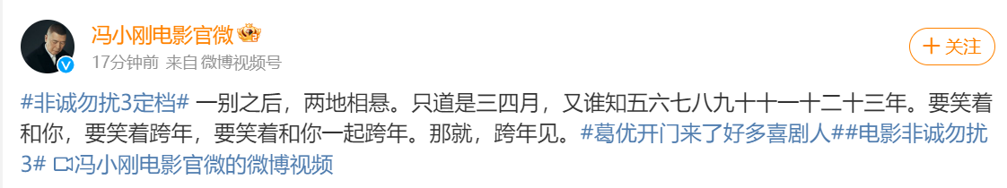 冯小刚微博宣布电影《非诚勿扰3》定档12月30日