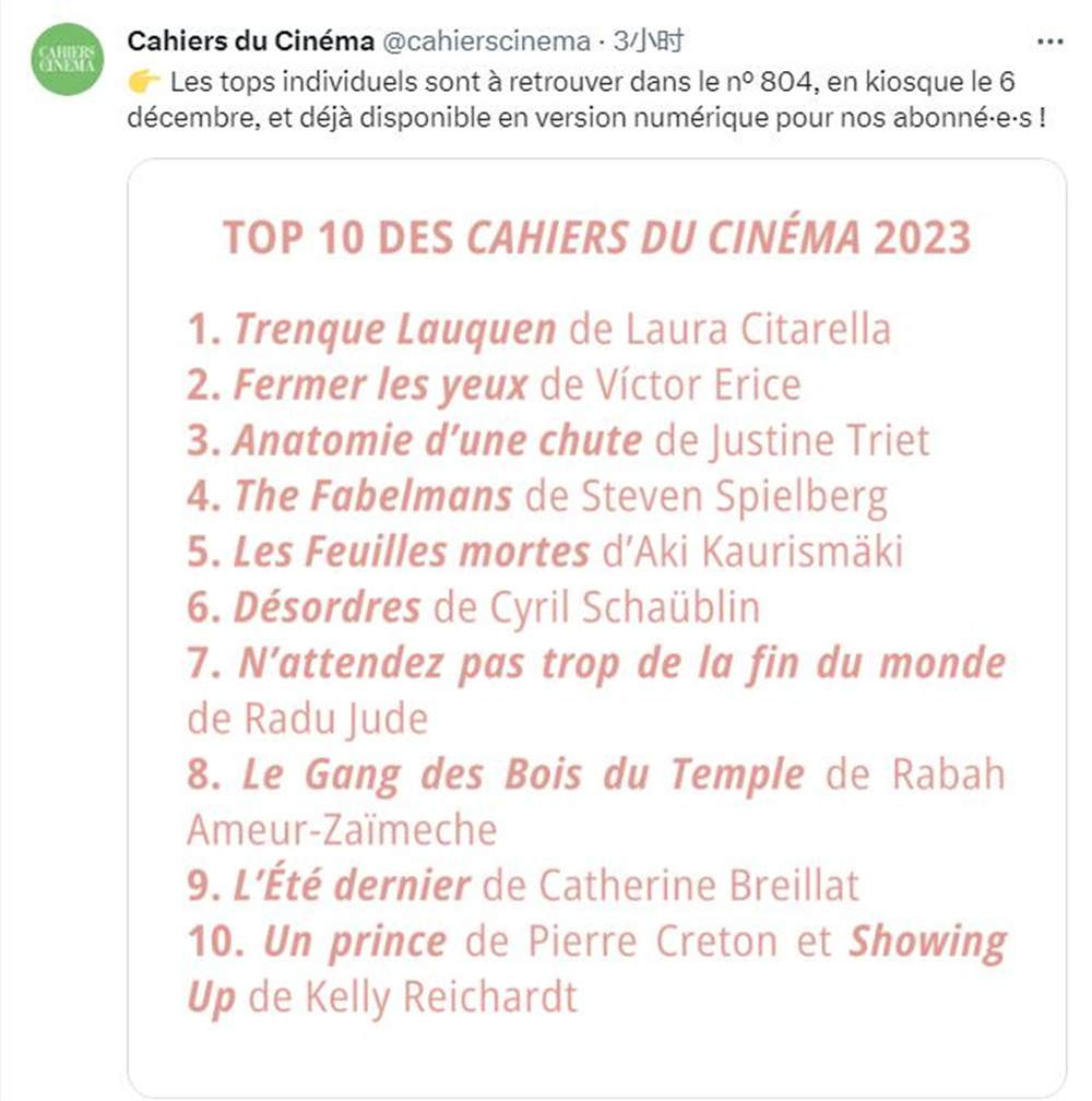 《电影手册》杂志在官方社交媒体上率先公布了其评选的2023年度十佳影片。