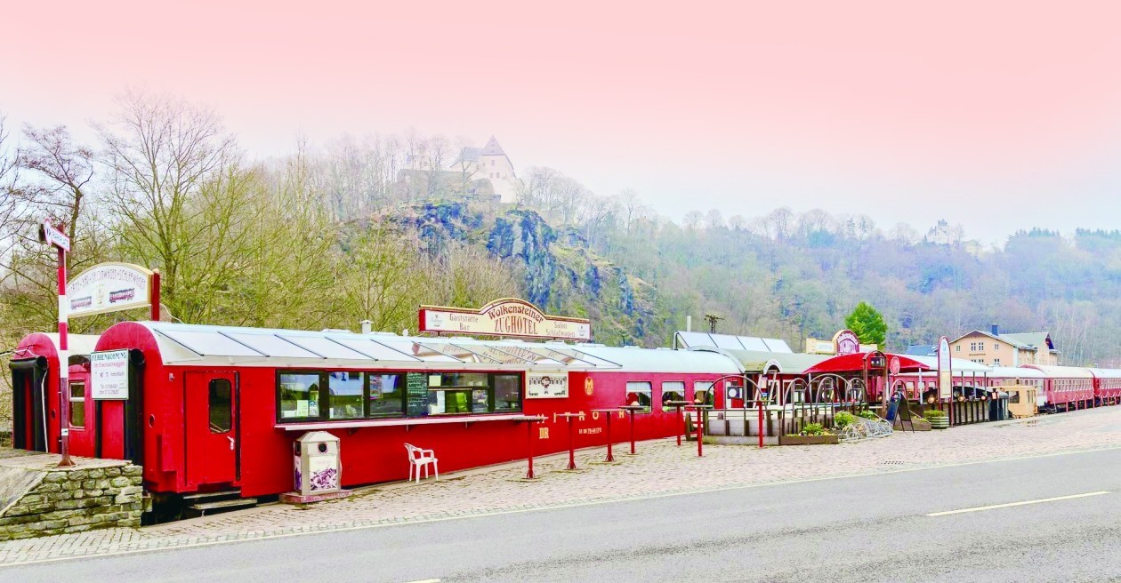 德国东部厄尔士山脉中的沃尔肯施泰因拥有一家有趣的住宿地——沃尔肯施泰因火车旅馆。从德累斯顿乘坐火车到沃尔肯施泰因需要近一个半小时,走出颇具年代感的火车站,一片红红绿绿的车厢映入眼帘。