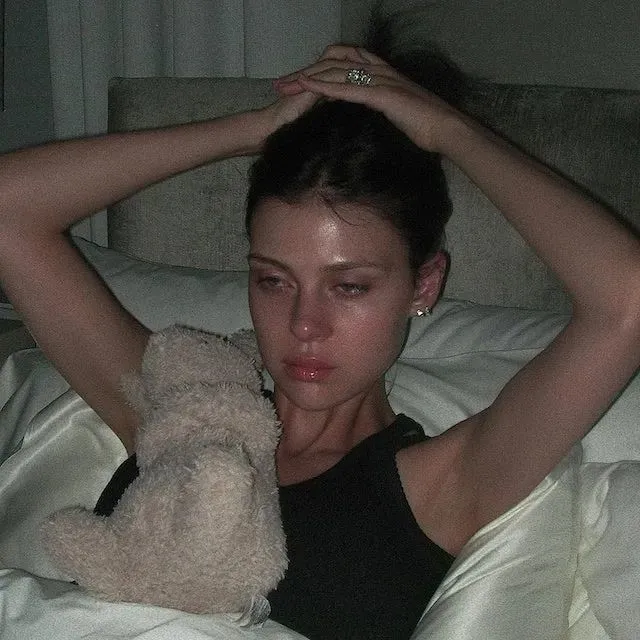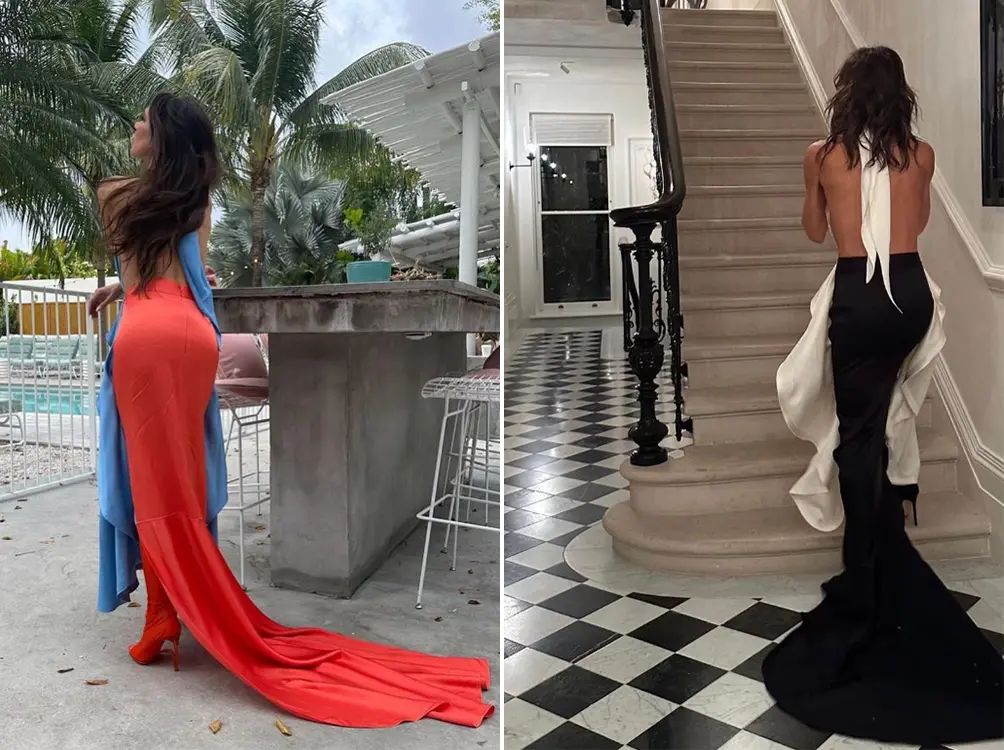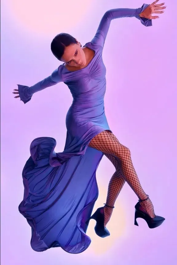 最近穿圣罗兰和自家品牌礼服拍艺术大片,状态依然能打。