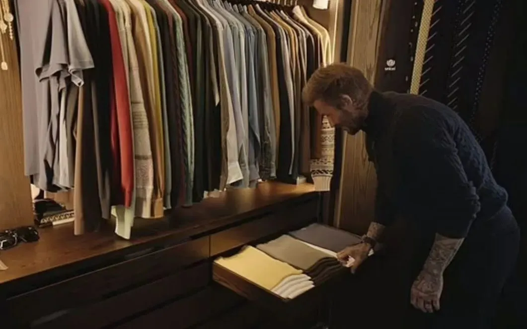在纪录片《贝克汉姆》里,小贝还晒出他的衣橱,整齐有序的画风,一如既往地强迫症——“一切都很有条理,夹克、牛仔衬衫、衬衫,然后从毛衣、羊毛衫到T恤、内衣袜子,然后是西装”。