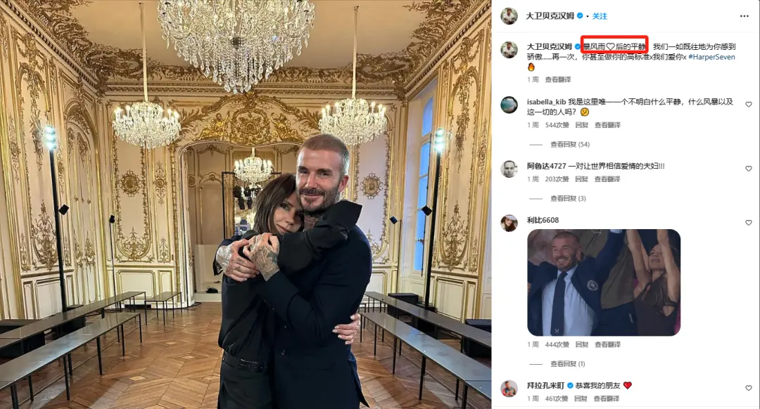 纪录片一播出,立刻上了头条。小贝也恰逢其时地晒出亲密结婚纪念照,配文“暴风雨后的平静”。