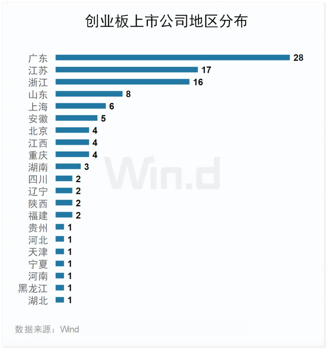 2023年发行的创业板公司主要集中在广东、江苏和浙江,发行数量分别为28家、17家和16家,三地合计61家,占比超过55%。