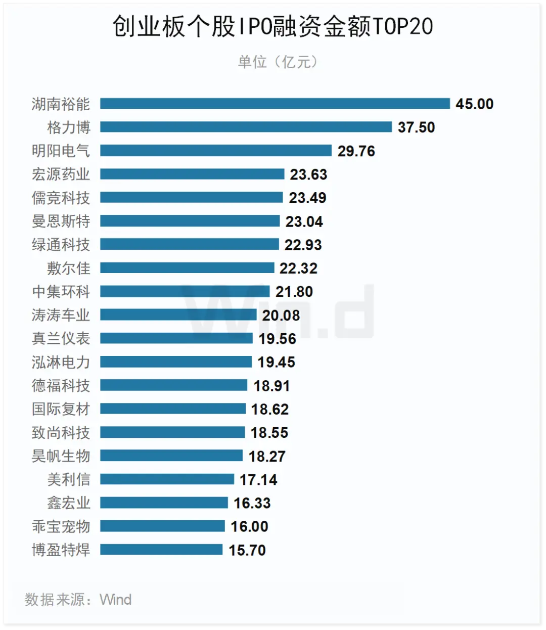 2023年湖南裕能IPO募资45亿元领先,格力博、明阳电气、宏源药业、儒竞科技等9家融资规模均在20亿元以上。