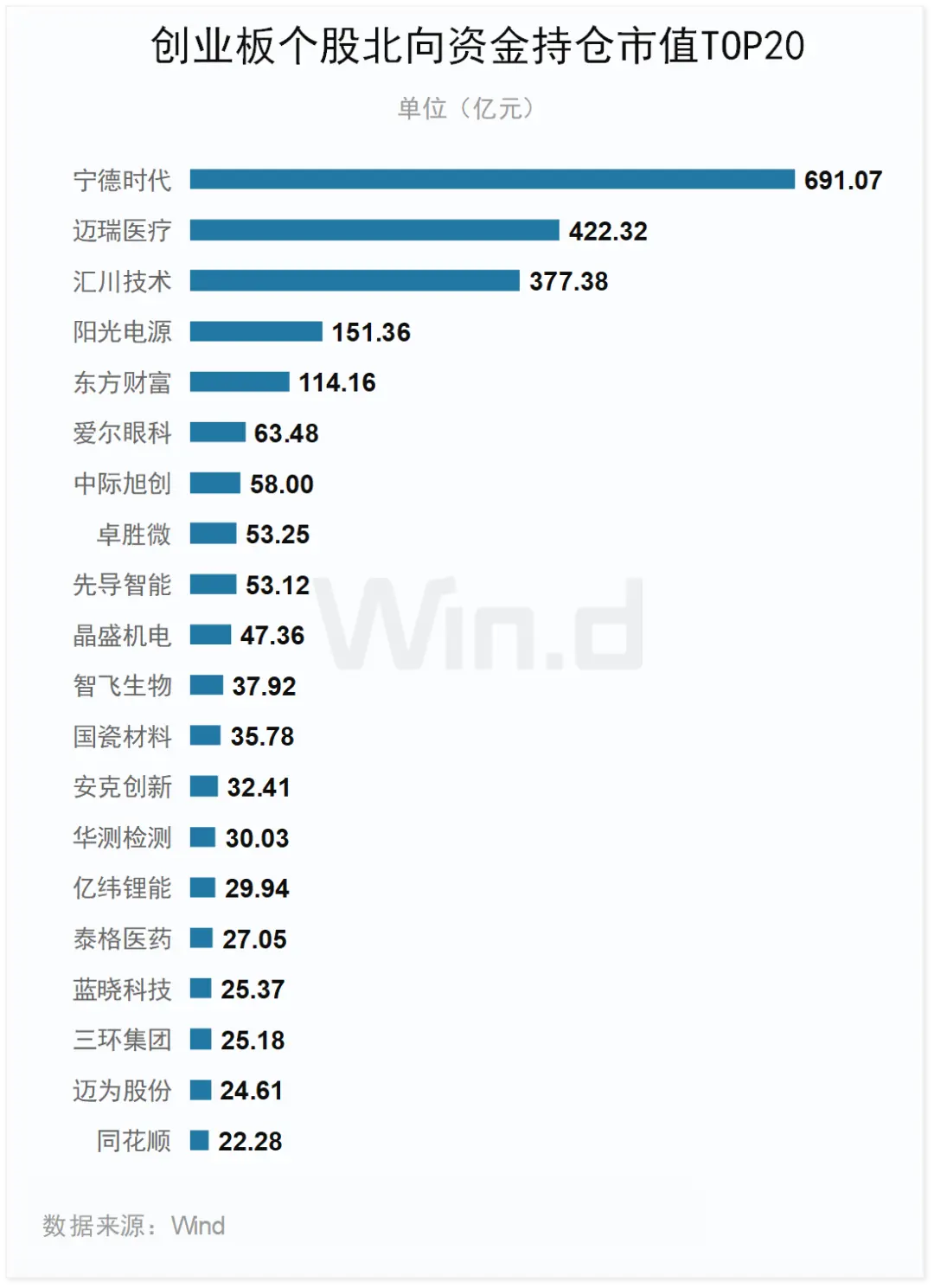 2023年末,北向资金持仓693家创业板公司,其中宁德时代持仓规模最大,达691.07亿。紧随其后迈瑞医疗、汇川技术、阳光电源和东方财富4只持仓市值均超过百亿元。