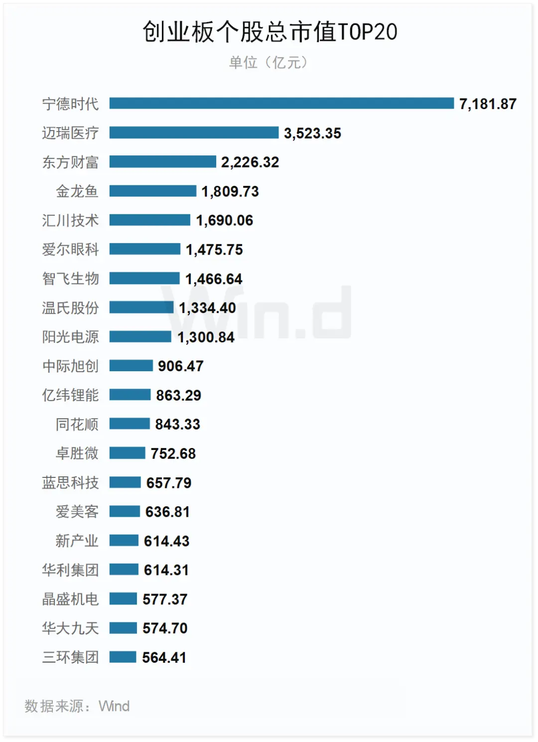 2023年末,宁德时代以总市值7181.87亿元位居首位,迈瑞医疗、东方财富、金龙鱼等8家公司总市值均超千亿。