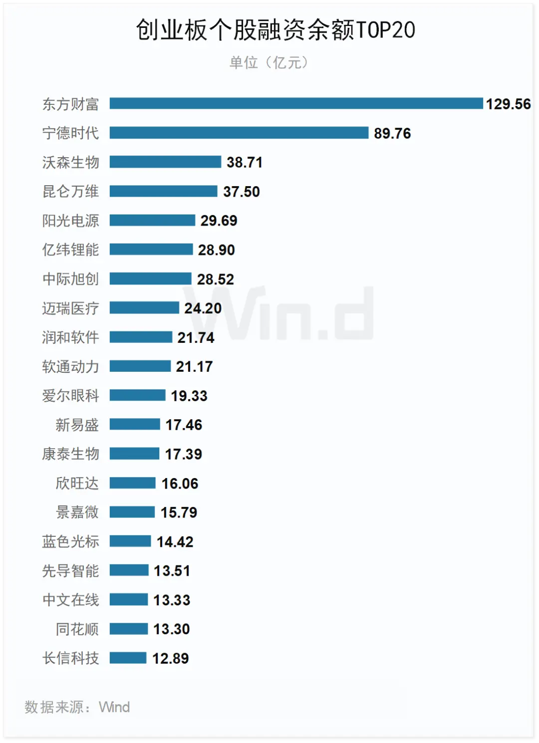 2023年末,东方财富融资余额达129.56亿元居首位,宁德时代、沃森生物、昆仑万维等9家融资余额均超过20亿元。