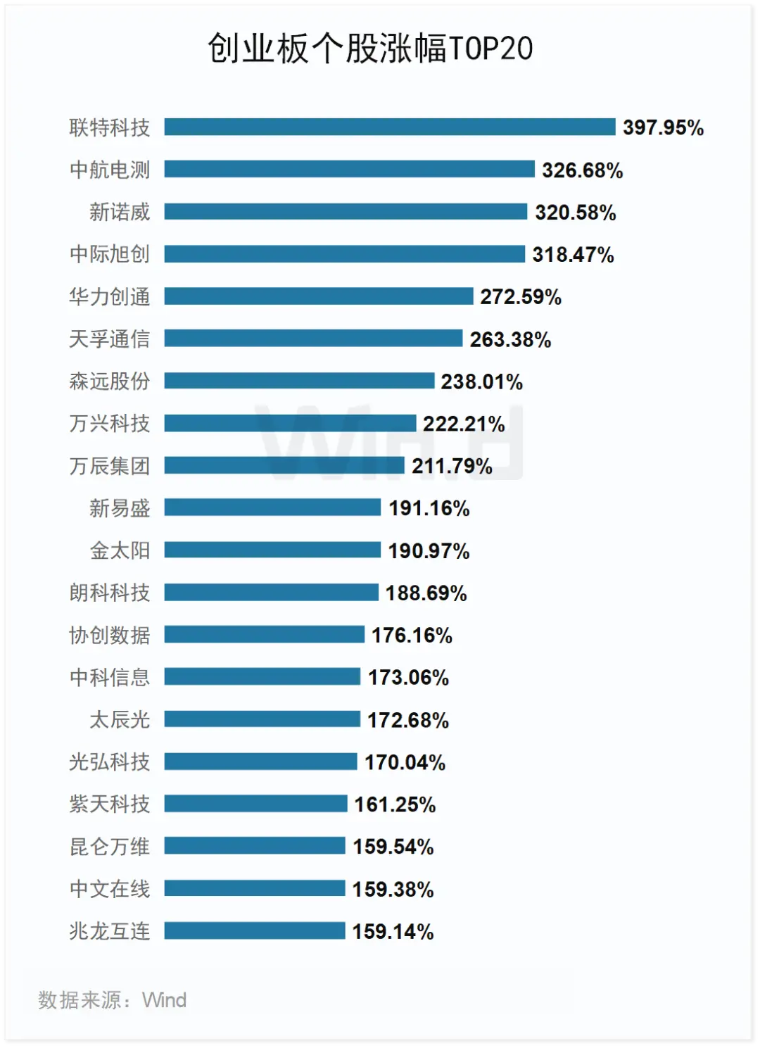 2023年创业板个股有789只上涨(剔除新股上市首日涨幅),占比59.19%。联特科技以大涨397.95%居首位,中航电测、新诺威和中际旭创等8家涨幅超过200%。