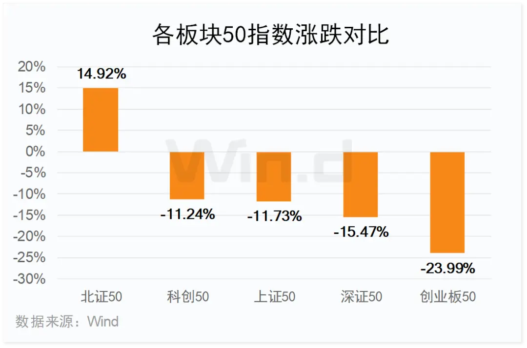 2023年各市场板块指数表现不一,北证50指数受到资金追捧,大涨14.92%。创业板50指数下跌23.99%排名居末。