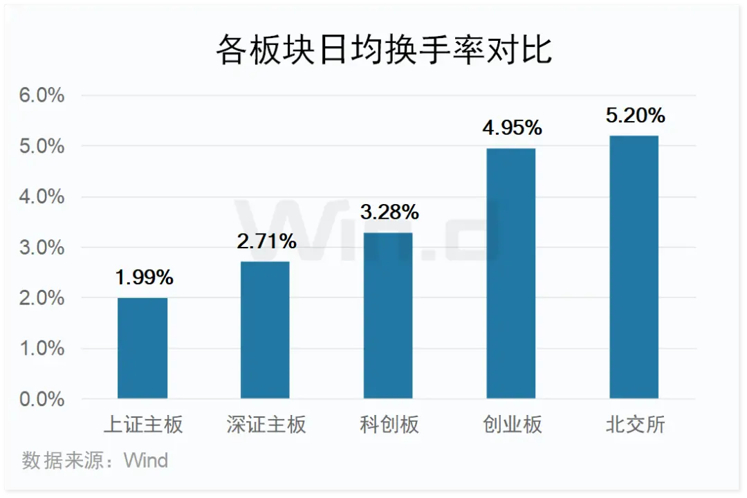 2023年,创业板日均换手率为4.95%,资金交易活跃,高于沪深主板和科创板。
