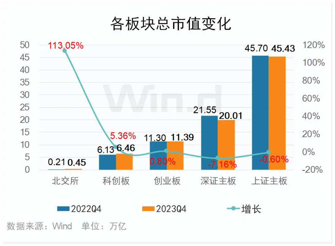 截至2023年末,创业板总市值为11.39万亿元,较2022年末总市值上升0.09万亿,增长0.80%,增幅低于北交所和科创板,但高于沪深主板。