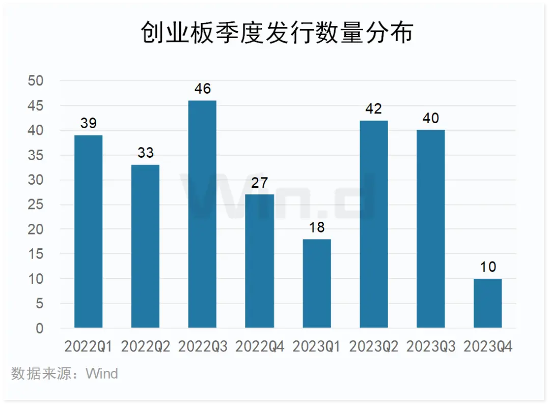 2023年末创业板共有1333家公司上市交易。以网上打新日期统计,创业板全年成功发行110家,较2022年145家同比下降24.14%,连续第二年下滑。