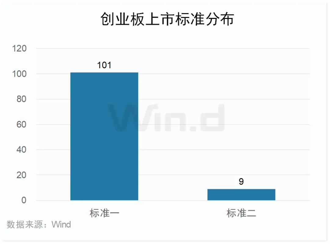 2023年发行的创业板公司中有101家以标准一上市,占比超过90%。标准一即最近两年净利润均为正,且累计净利润不低于人民币0.5亿元。此外还有9家以标准二上市,即预计市值不低于10亿元,最近一年净利润为正且营业收入不低于人民币1亿元。