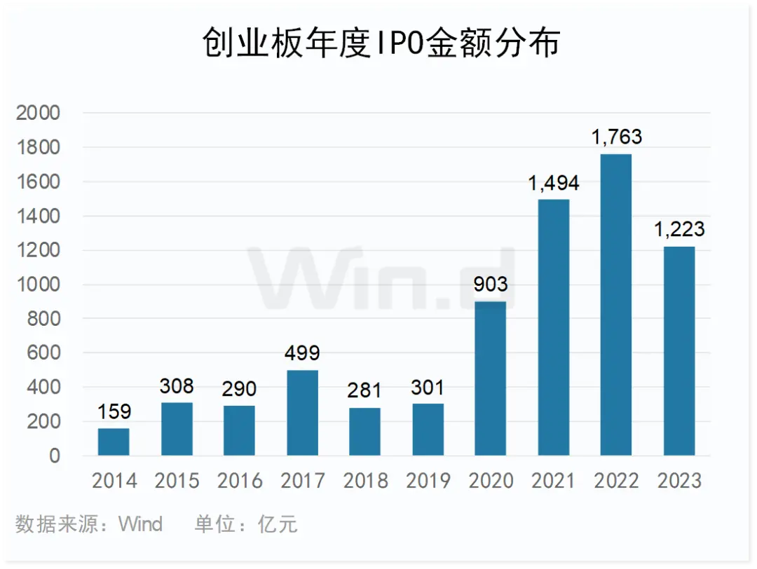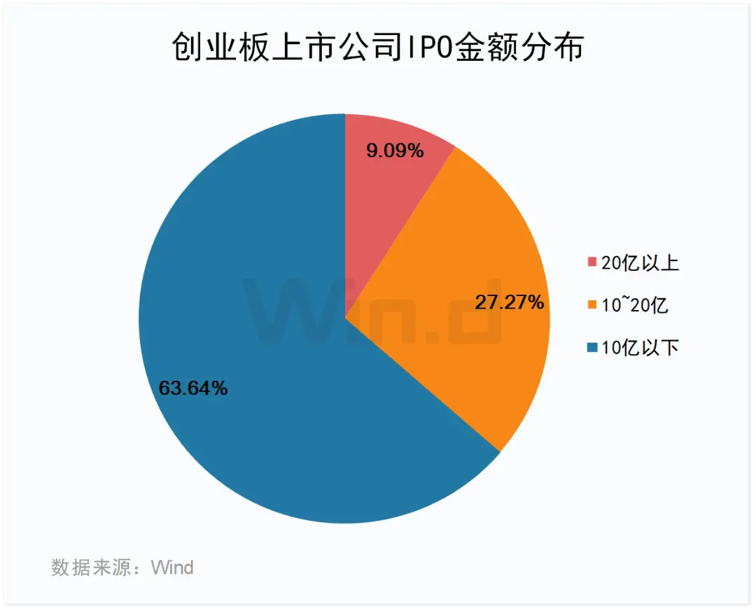 2023年创业板公司IPO合计融资1223.11亿元,同比下降30.63%。10家融资超过20亿元,30家融资在10至20亿元之间。融资10亿元以下公司数量最多,共70家,占比超60%。